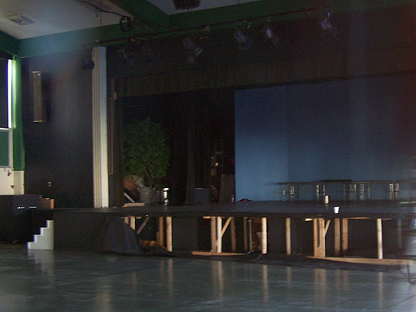 The stage. At least they finally painted the frame black. And they have a nice dark green act curtain and black legs.